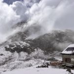 Über Nacht hat es an den Pässen und Gipfeln ein wenig geschneit. Bei der Hütte ist es schneefrei. Für geübte Wanderer sind die Pässe aber auch heute gut machbar, und mit der Sonne von morgen wird der Schnee dann schnell wieder weg sein.